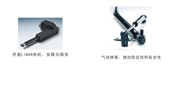電動(dòng)升降床,包括可升降床體和設(shè)置在床體上的活動(dòng)床墊板,活動(dòng)床墊板的頭部靠背段和中部平躺段之間為鉸接結(jié)構(gòu),活動(dòng)床墊板的頭部靠背段由進(jìn)口氣動(dòng)彈簧定位,安全可靠。