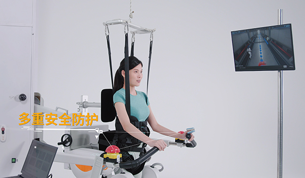 步態(tài)訓(xùn)練與評估系統(tǒng) A3-2,是一款針對步行功能障礙進(jìn)行高效康復(fù)訓(xùn)練的下肢康復(fù)機(jī)器人。產(chǎn)品由計算機(jī)控制系統(tǒng)、步態(tài)矯正裝置系統(tǒng)、動靜態(tài)減重系統(tǒng)、醫(yī)用跑臺系統(tǒng)以及情景互動訓(xùn)練系統(tǒng)五大模塊組成。它可以使患者在直立體位下通過不斷重復(fù)且軌跡固定的步態(tài)訓(xùn)練,強(qiáng)化正常步態(tài)記憶,促進(jìn)患者本體感覺的輸入與正確運動模式的形成,從而加強(qiáng)大腦結(jié)構(gòu)和功能重塑,建立正確的行走模式并有效的鍛煉其相關(guān)肌肉與關(guān)節(jié),加速下肢功能的恢復(fù)。既能讓平衡差、肌力差、無法站立的惠者盡早進(jìn)行步行訓(xùn)練,也能讓處于步行訓(xùn)練期的患者得到從足跟著地到足尖離地的完整性步態(tài)周期訓(xùn)練,是不斷重復(fù)的標(biāo)準(zhǔn)化生理步態(tài)模式。