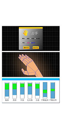 評估功能:系統(tǒng)的評估功能通過手部六個傳感器可評估患者主動活動以及被動活動的活動范圍,通過主動以及被動評估范圍的對比,讓治療師了解患者的各個手指活動范圍以及受限的情況,為患者設(shè)計(jì)針對性的訓(xùn)練方案,系統(tǒng)根據(jù)評估結(jié)果設(shè)定訓(xùn)練的難度系數(shù)。